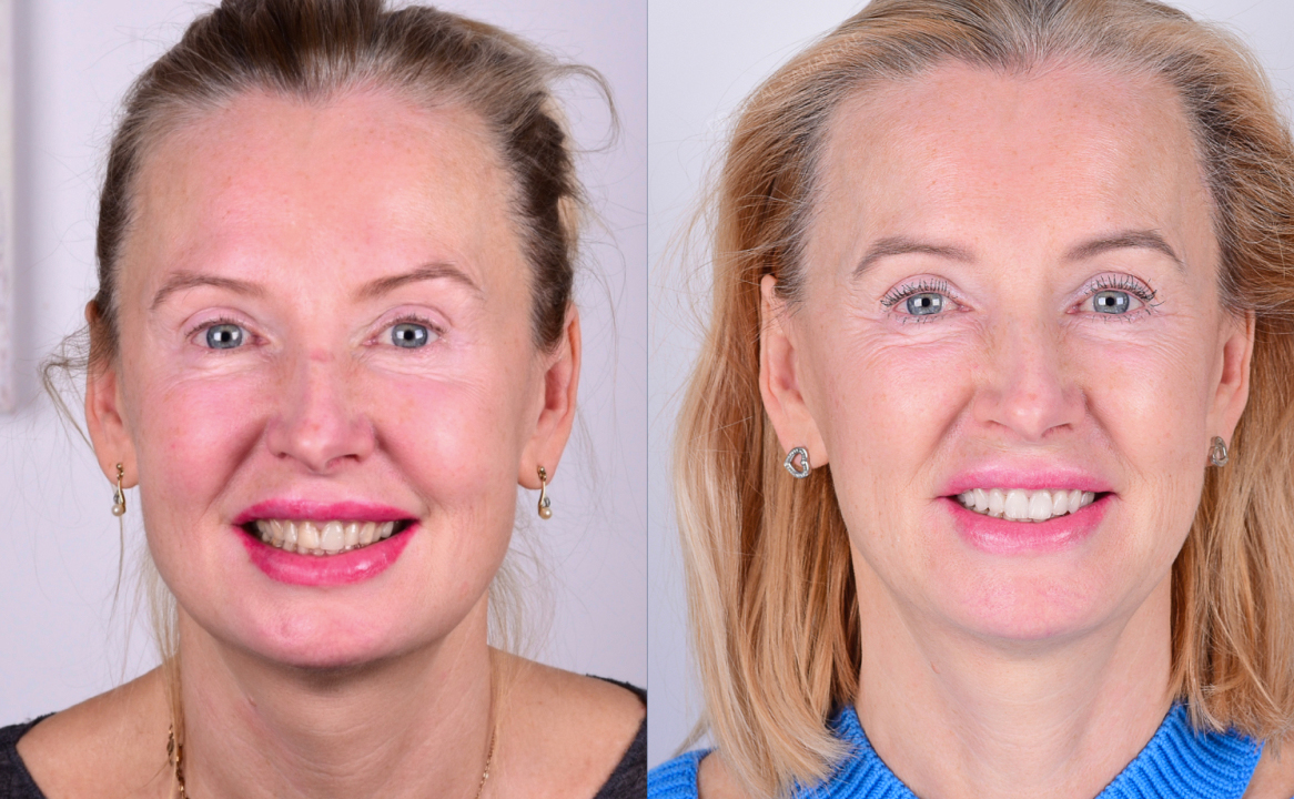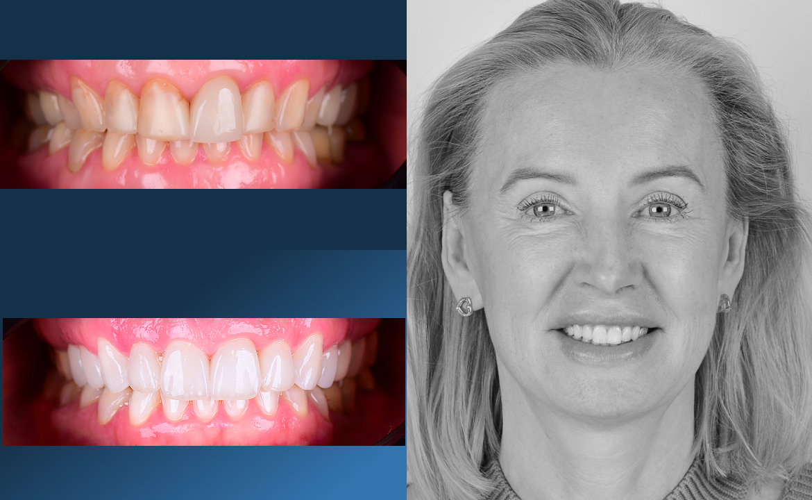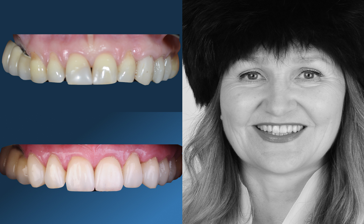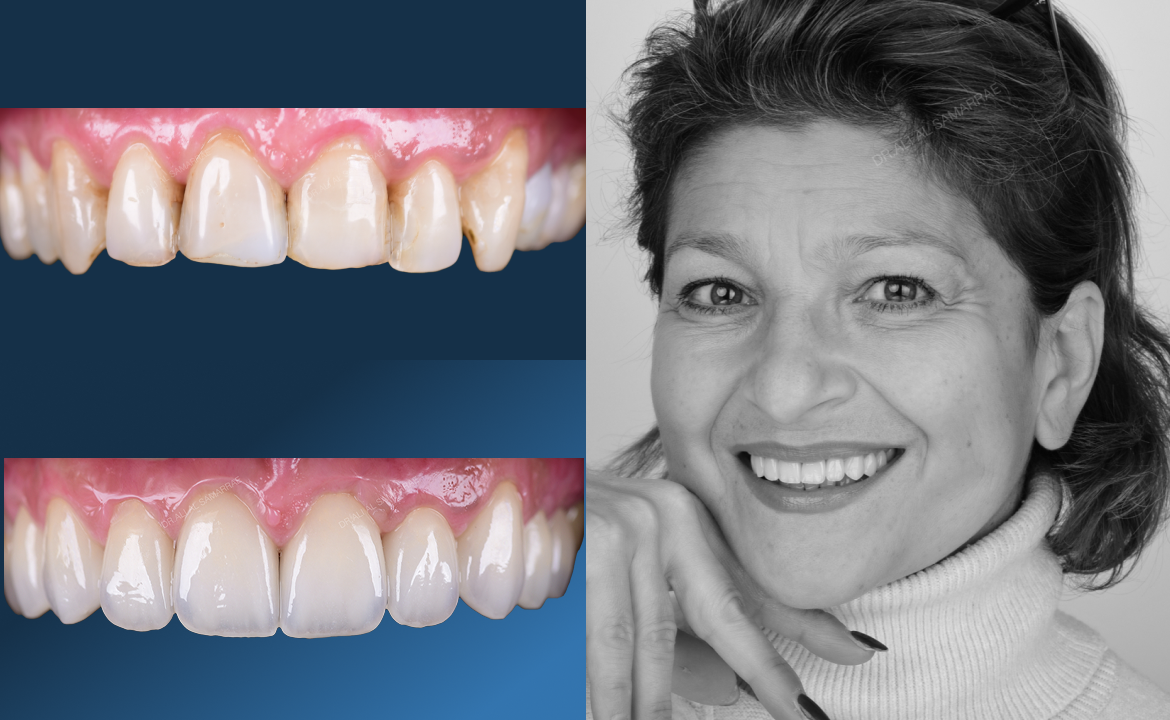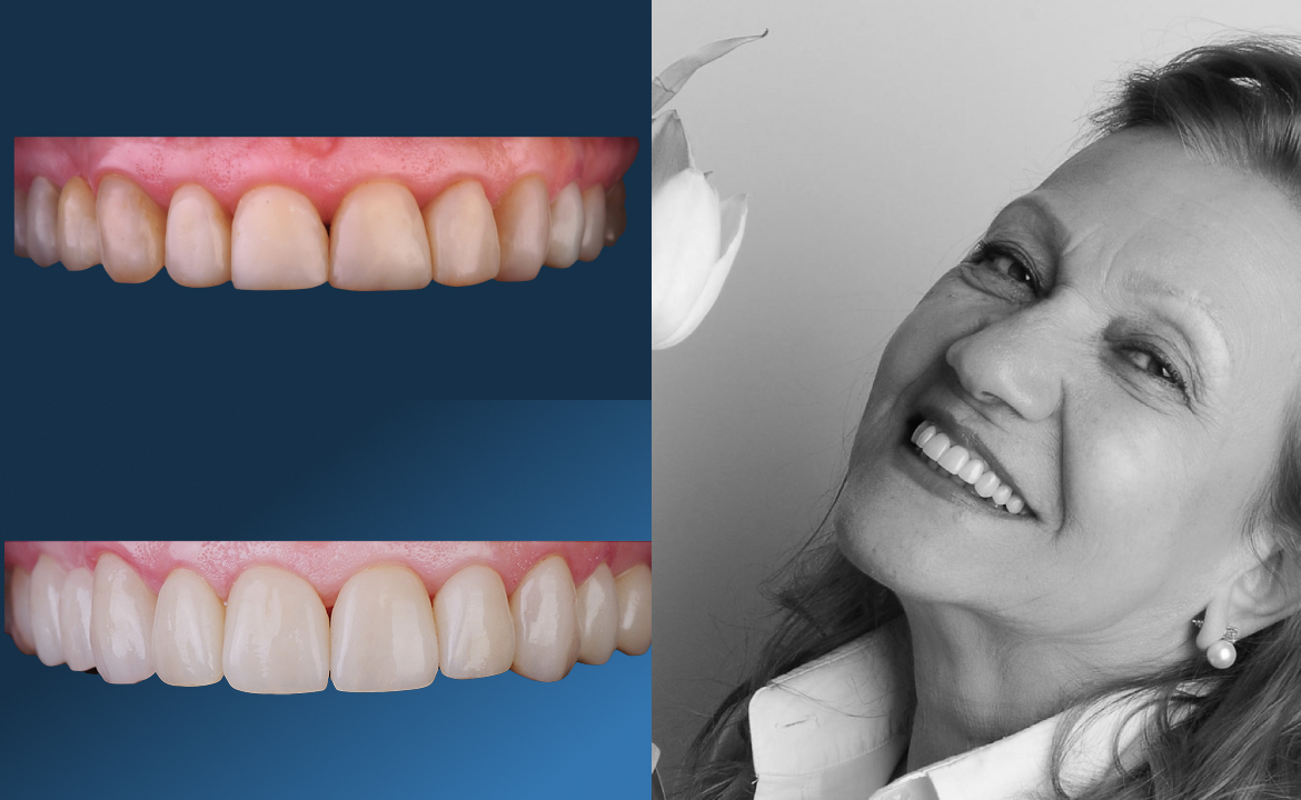 Insgesamt wurden 20 alte Kronen im Ober- und Unterkiefer durch neue, individuell angefertigte Restaurationen mit transparentem, femininen Look ersetzt. Begleitend erfolgten aufwendige mikrochirurgische Eingriffe zur Stabilisierung und Regeneration des Zahnfleisches. Das Ergebnis: ein
