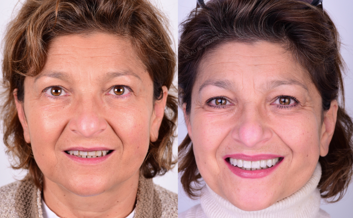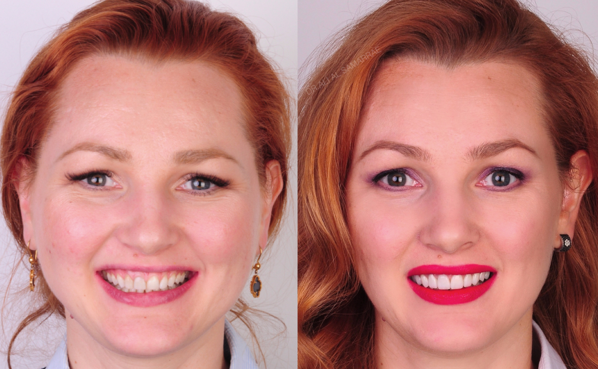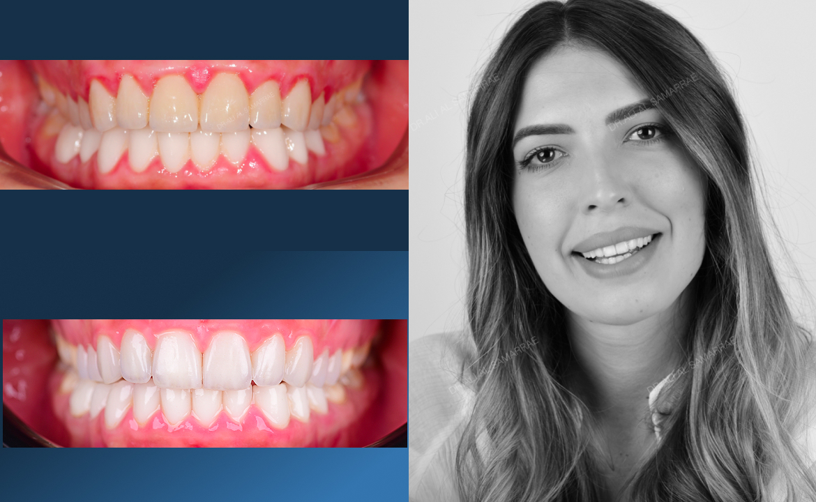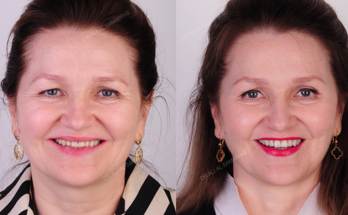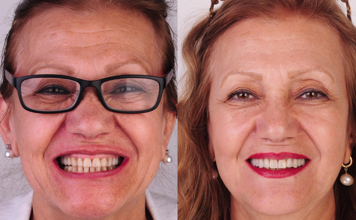 Insgesamt wurden 20 alte Kronen im Ober- und Unterkiefer durch neue, individuell angefertigte Restaurationen mit transparentem, femininen Look ersetzt. Begleitend erfolgten aufwendige mikrochirurgische Eingriffe zur Stabilisierung und Regeneration des Zahnfleisches. Das Ergebnis: ein