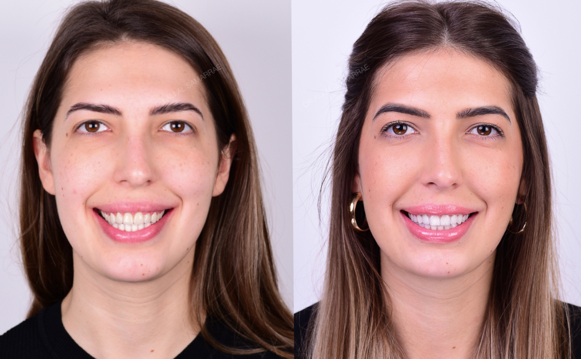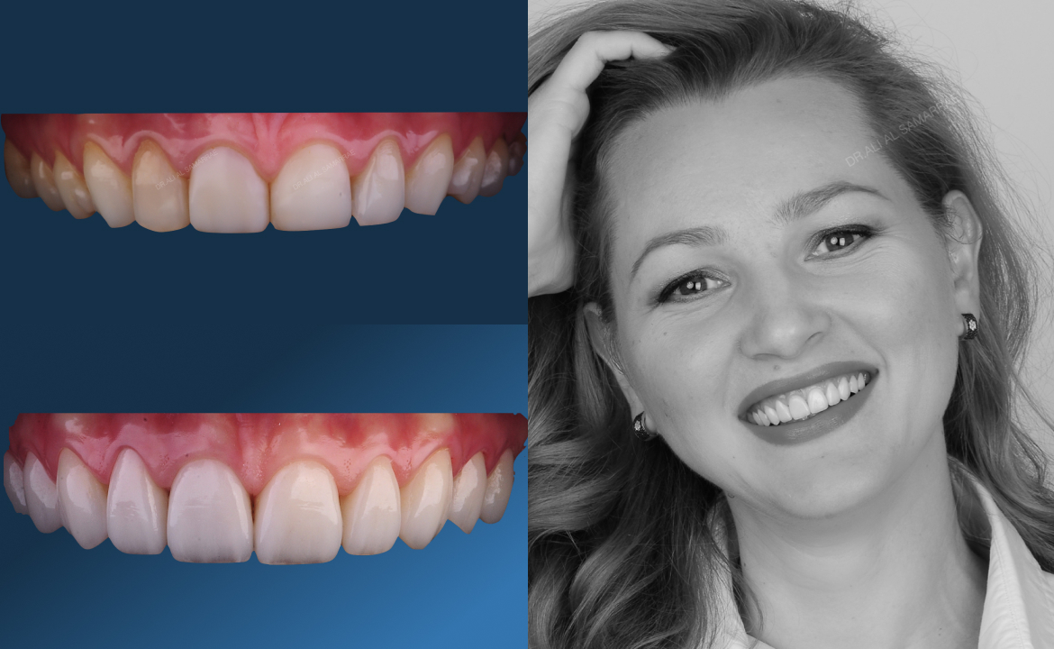 Die Patientin hatte stark verfärbte, matte Composite-Veneers, einen ausgeprägten „Gummy Smile” sowie einen fehlenden Zahn auf der linken Seite nach einer vorherigen Extraktion. Mithilfe von 7 individuell gestalteten Veneers und einer Brücke wurde das Lächeln vollständig in Farbe, Form und Proportion neugestaltet. Diese ästhetische Rehabilitation mit Veneers in Wien überzeugt durch helle, transparente Oberflächen und eine femininen, natürlich wirkende Zahnform – für ein harmonisches und selbstbewusstes Erscheinungsbild.