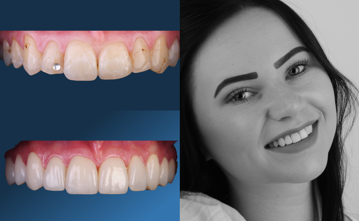 In diesem Fall wurden alte Kronen sowie veraltete Kunststofffüllungen im Oberkiefer entfernt und durch neue, individuell angefertigte Kronen und EmaxVeneers ersetzt. Die Zahnachse wurde dabei gezielt korrigiert, um die Ästhetik zu optimieren und ein breiteres, feminines