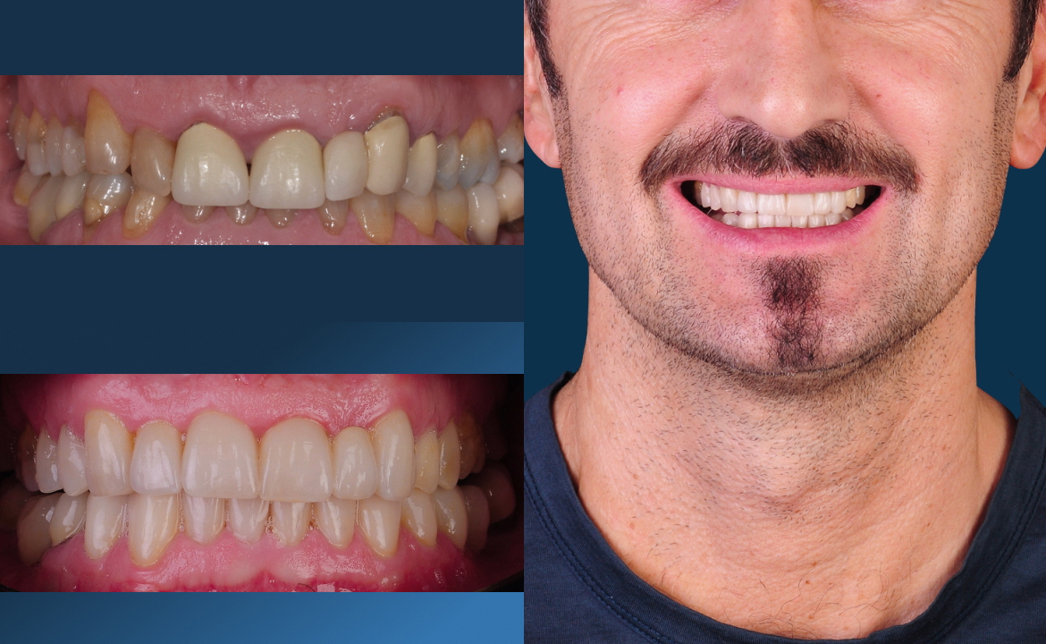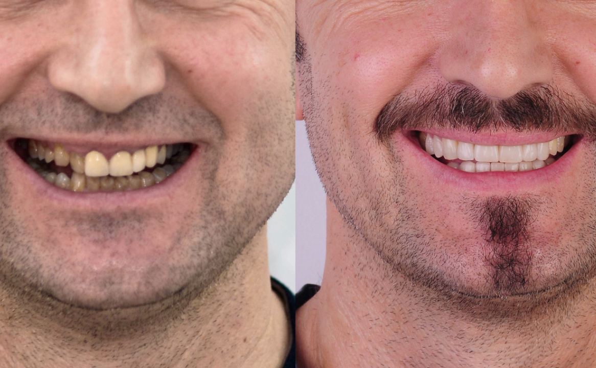 Ein Patient mit alten Kronenversorgungen, schiefen Zähnen und ungleichmäßigem Zahnniveau wurde zunächst kieferorthopädisch behandelt, um die Ausgangssituation funktionell zu optimieren. Anschließend wurde mit einer ästhetisch abgestimmten Kombination aus Kronen